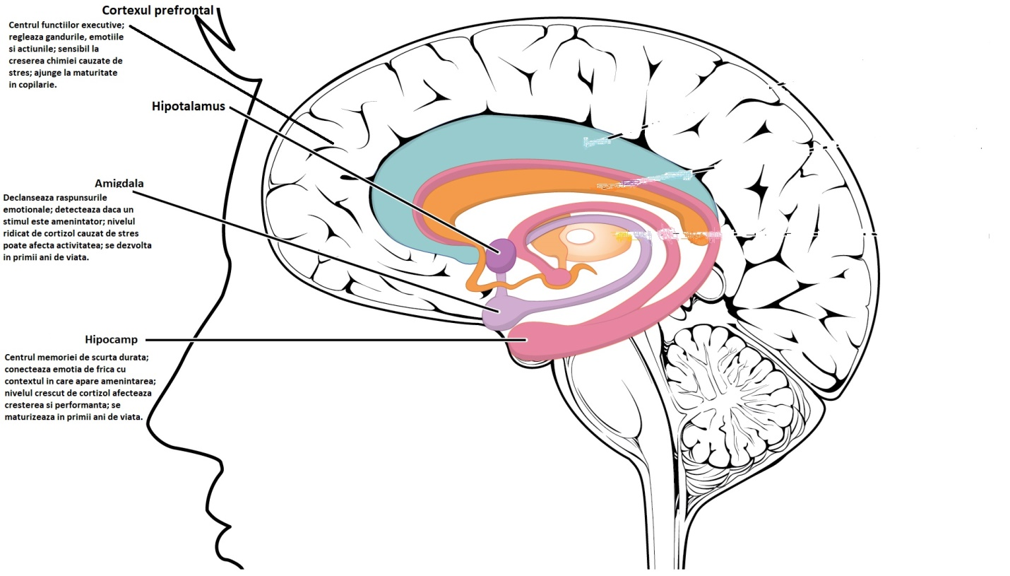 sursă - National Scientific Council on The Developing Child (2010) Persistent Fear adn Anxiety Can Affect Young Children’s Learning and Development. Working paper no. 9. http://www.developingchild.net , Child and Family Training Care este impactul stresului toxic?Expunerea prelungită la stresul toxic determină apariția anxietății și fricii. Anxietatea și frică determină o serie de modificări în diferite zone ale creierului – amigdala, hipocamp si zone ale lobilor prefrontali. Studiile ne arată că lobul frontal, denumit ”centrul acțiunilor executive” și al “controlului emoțional”, reglează gândurile, emoțiile și acțiunile. Acesta este în mod deosebit sensibil la impactul hormonului numit cortizolul (”hormonul stresului”). Sub influența factorilor de stres (de exemplu în condiții de neglijare și abuz) cortizolul produce o activare energetică intensă la nivelul lobilor ceea ce va conduce la o serie de gânduri distructive și reacții comportamentale negative (retragere sau agresivitate).